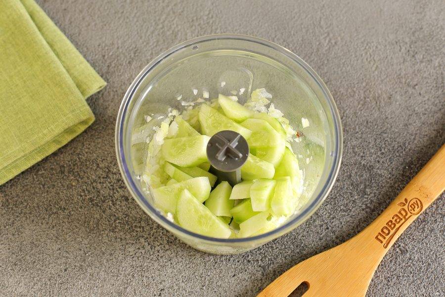 Сельдерей измельчите и добавьте нарезанный огурец. Я шкурку снимаю, но можете ее оставить по желанию.