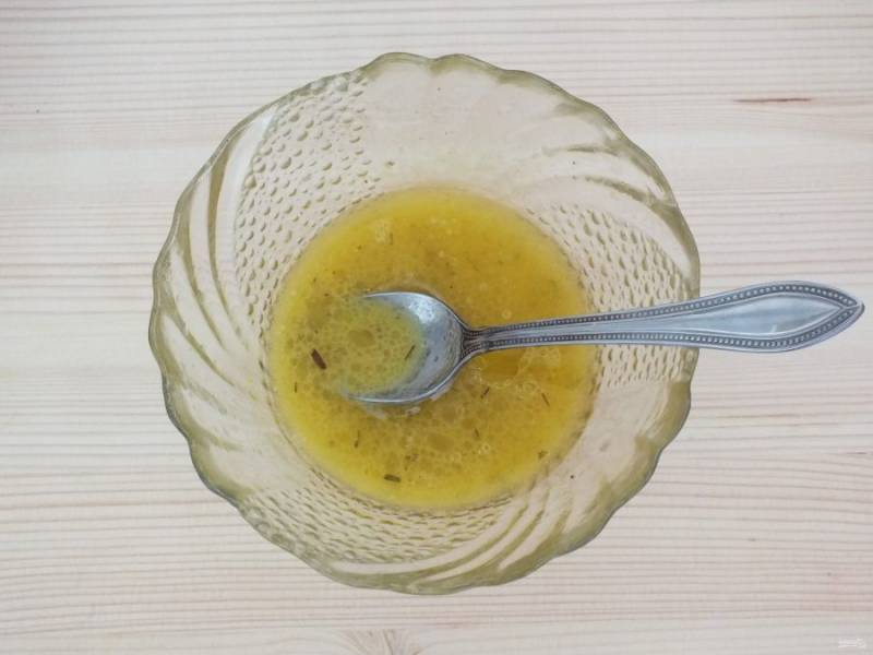 Приготовьте заправку. Смешайте 2 ст. ложки лимонного сока, 30 мл. оливкового масла, горчицу с зернами, соль по вкусу.