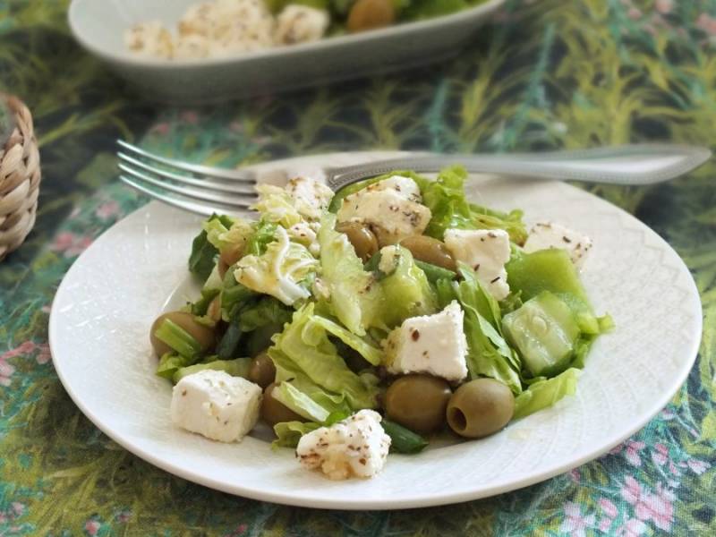 Греческий салат любят многие за его лёгкость, яркие краски, простоту приготовления. Предлагаю приготовить салат в одном цвете - в зеленом. Уверена, что вы останетесь довольны и внешнем видом и вкусом.