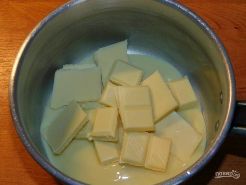 Отдельно соедините белый шоколад и сгущенку. Влейте горячую сахарную смесь и мешайте, чтобы шоколад растаял.