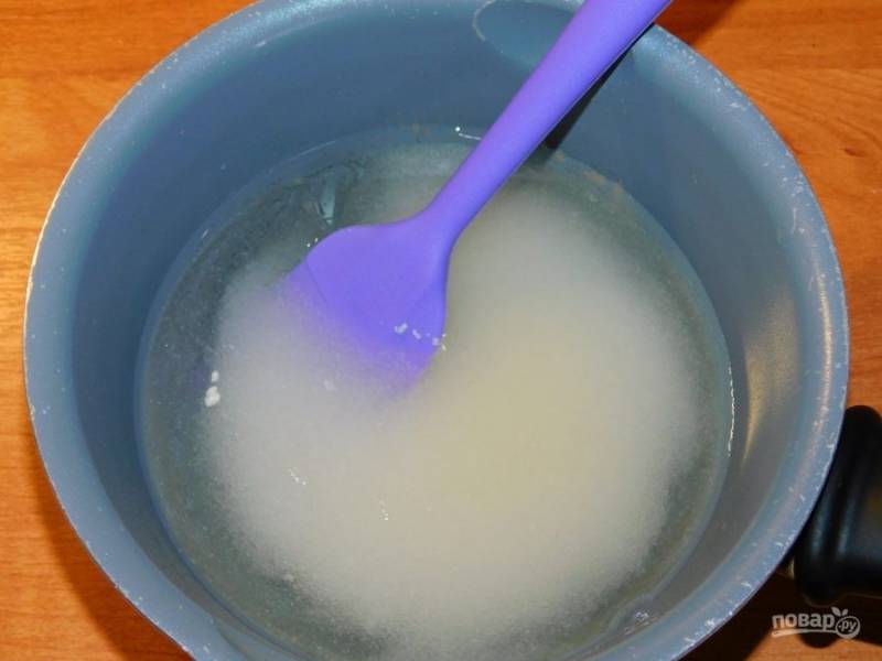 Затем соедините сироп глюкозы, сахар и воду. Поставьте греться, чтобы сахар полностью растворился.