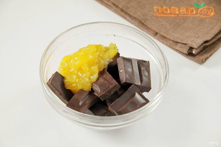 Украсить кекс можно на свой вкус. Я предлагаю приготовить ароматную шоколадную глазурь. Для этого поломайте шоколад на кусочки, добавьте 1 ст. л. апельсинового джема и примерно 0,5 ст. л. воды. Растопите в микроволновке или на водяной бане.