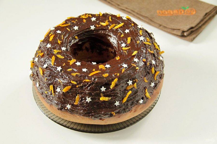 Готовый кекс переверните и покройте еще теплой шоколадно-апельсиновой глазурью. Сверху я натерла еще немного апельсиновой цедры и украсила кондитерскими украшениями.