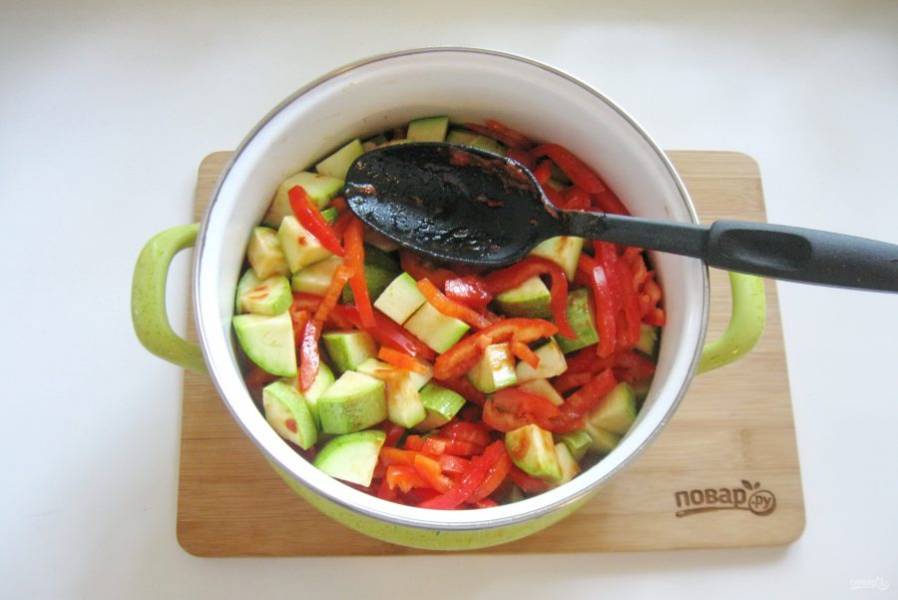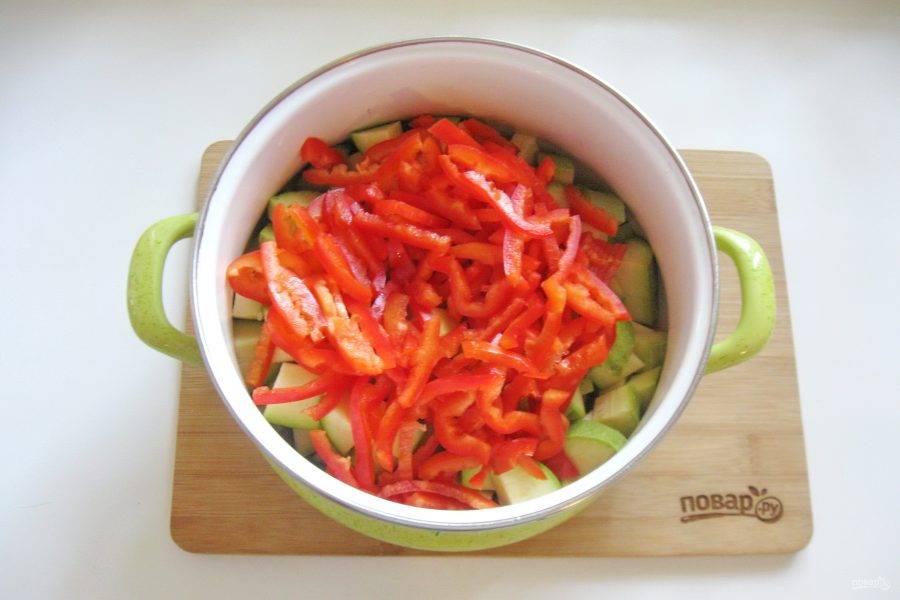 Болгарский перец помойте, очистите от семян и нарежьте произвольно. Я нарезала соломкой. Добавьте к нарезанным кабачкам.