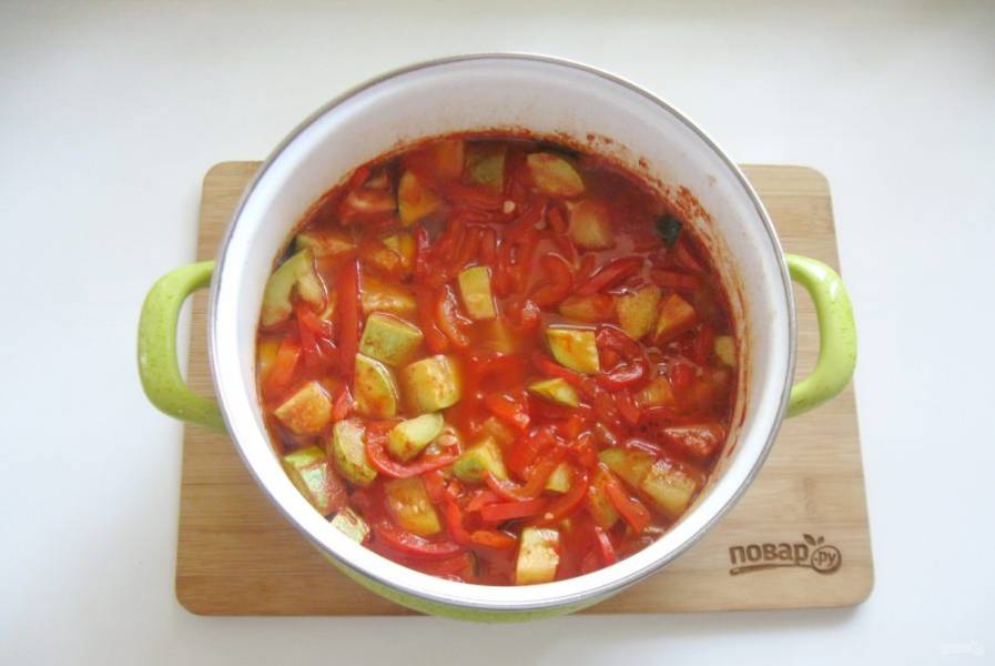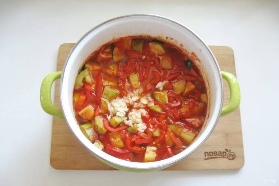 В конце добавьте уксус и измельченный чеснок. Перемешайте, попробуйте и если вам не хватает соли или сахара, то добавьте. Проварите еще 3-4 минуты и выключайте.