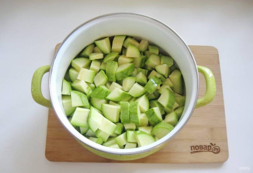 Кабачки помойте и нарежьте кубиками. Старые следует очистить и удалить крупные семечки. С молодыми этого можно не делать.