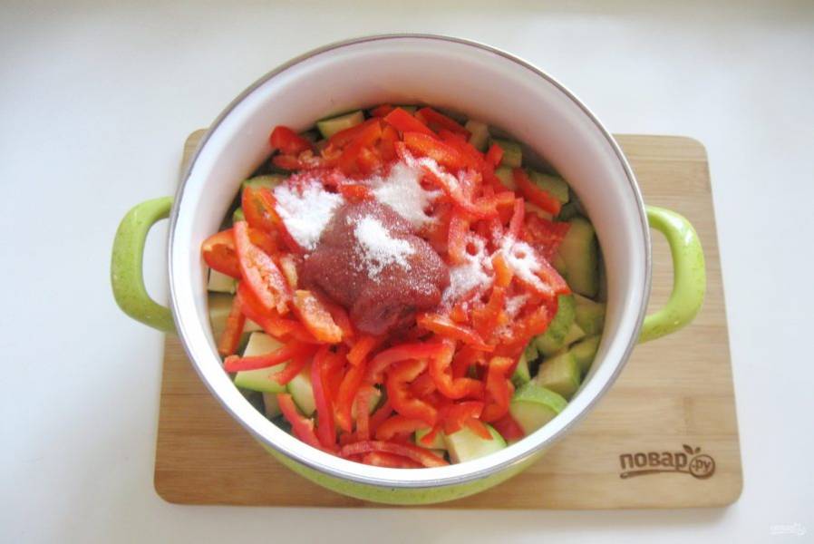 Добавьте соль, сахар и подсолнечное масло. Налейте 200 мл. воды. Много воды наливать не нужно, в процессе приготовления овощи пустят много сока. Если вам покажется, что жидкости мало, то воду всегда можно долить.