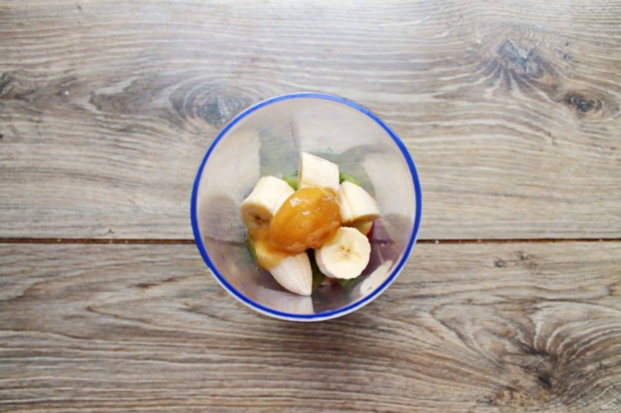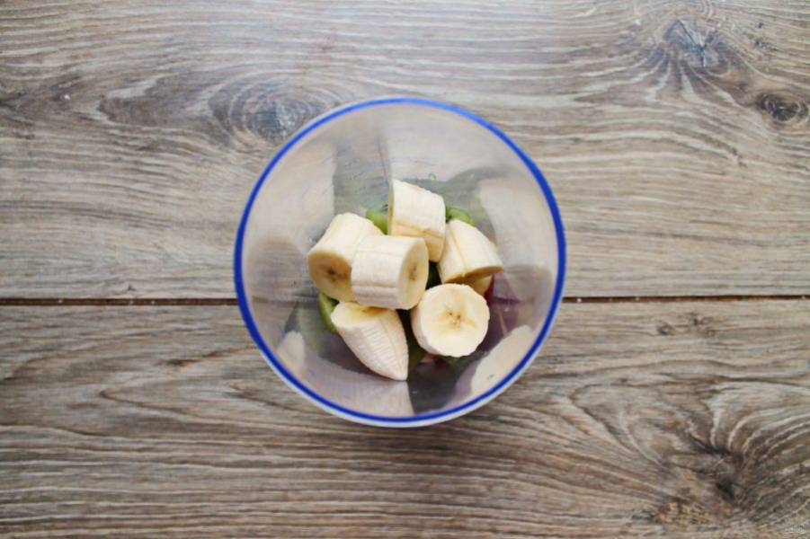У банана удалите шкурку, порежьте и добавьте к яблоку и киви.
