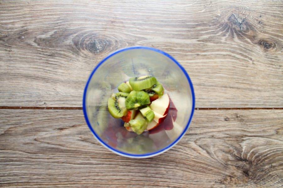 У киви срежьте кожуру, порежьте на кусочки и добавьте к яблоку.