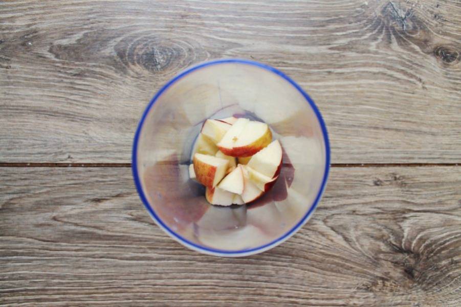 У яблока удалите сердцевину, разрежьте на кусочки и выложите в чашу блендера.