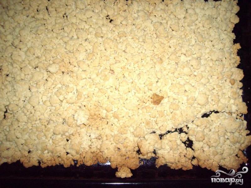 Тесто достать из холодильника и пропустить через мясорубку, либо натереть на терке. Я его просто крошу руками на противень.