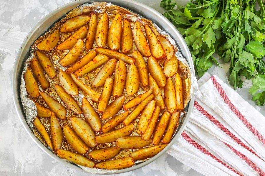 Застелите противень или форму для запекания фольгой либо пергаментной бумагой, выложите на нее картофельную нарезку кожурой вниз. По краям емкости влейте воду на дно формы. Поместите в духовку форму и запекайте при 200 градусах около 25 минут.