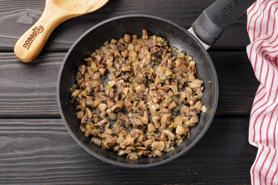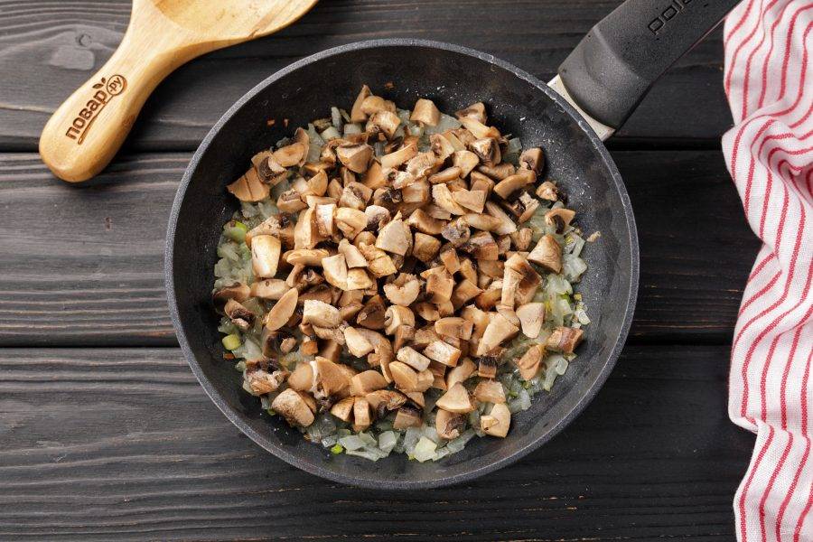 Добавьте нарезанные кубиками шампиньоны и готовьте до испарения жидкости.