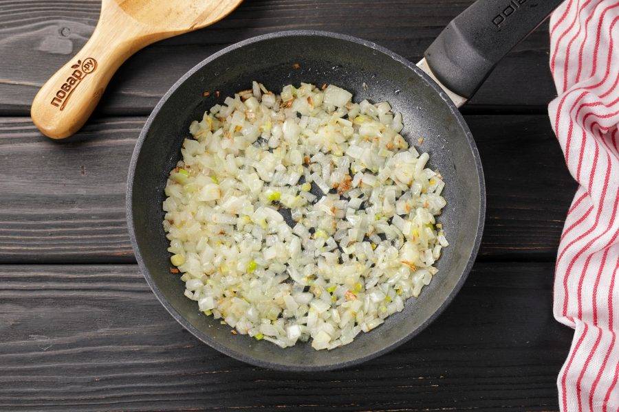 Тем временем лук нарежьте кубиками и обжарьте на растительном масле до готовности.