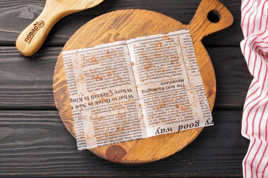 Вырежьте из пергамента квадраты нужного размера. Смажьте маслом и посыпьте специями.