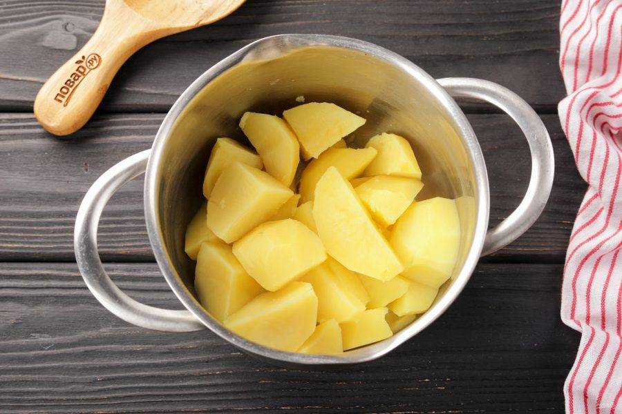 Картофель очистите, помойте и залейте холодной водой. Доведите до кипения и варите при среднем нагреве около 25-30 минут, до полного приготовления картофеля.