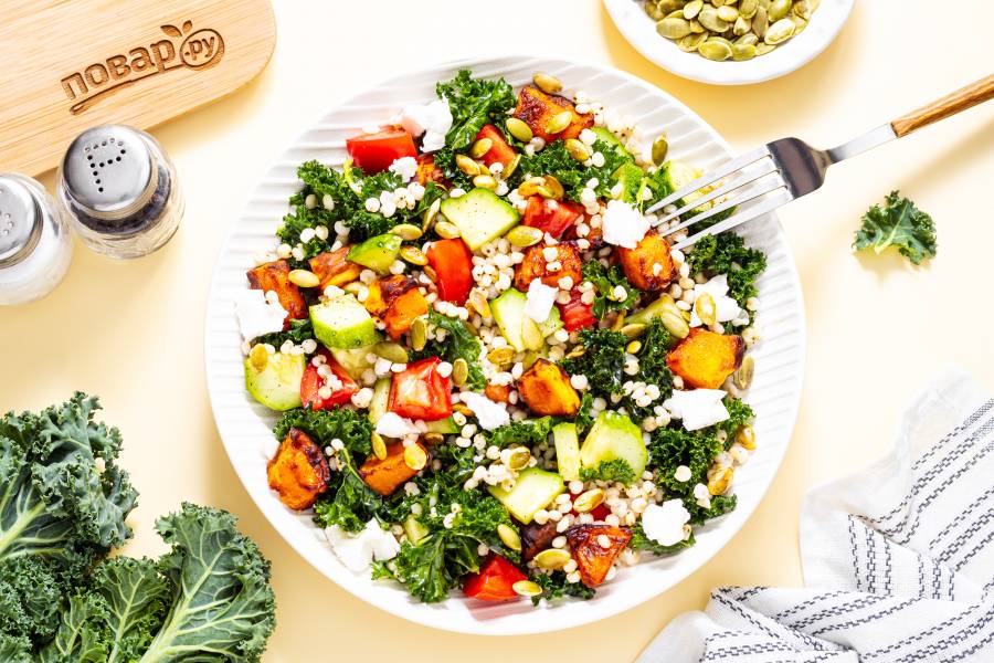 Хочу поделиться рецептом салата из сорго — крупы, которая внешне напоминает пшено. Кроме сорго в салате есть овощи, зелень, семечки и сыр фета.